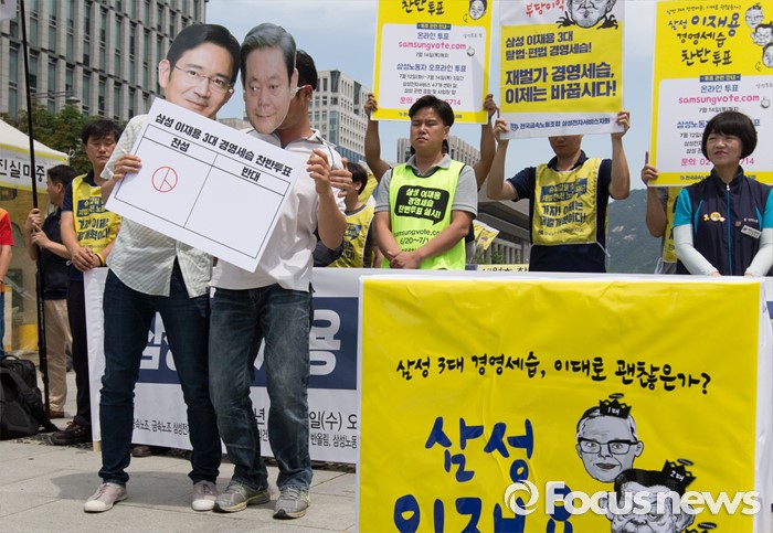 (서울=포커스뉴스) 29일 오전 서울 광화문광장에서 전국금속노동조합 삼성전자서비스지회와 반올림, 참여연대 등 시민단체들이 '삼성 이재용 3대 세습, 이대로 괜찮은가?' 찬반투표 선포 기자회견 후 투표 참여 독려 퍼포먼스를 펼치고 있다.