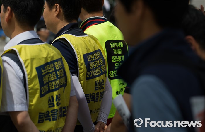 (서울=포커스뉴스) 29일 오전 서울 광화문광장에서 전국금속노동조합 삼성전자서비스지회와 반올림, 참여연대 등 시민단체들이 '삼성 이재용 3대 세습, 이대로 괜찮은가?' 찬반투표 선포 기자회견을 하고 있다.