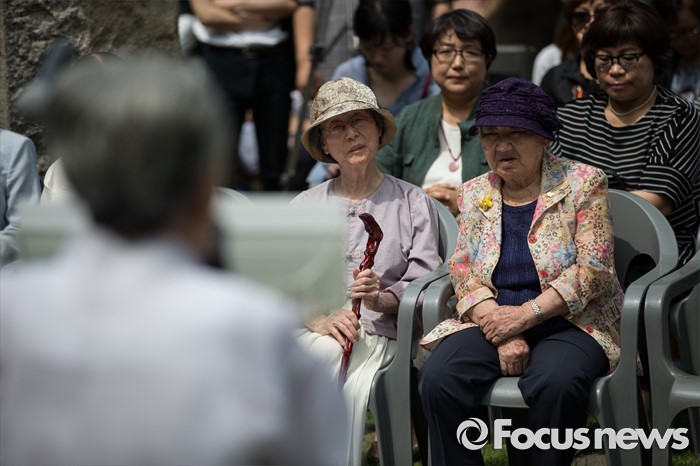 (서울=포커스뉴스) 29일 오전 서울 중구 예장동 옛 통감관저 터에서 열린 일본군 위안부 피해자 추모공원 '기억의 터' 기공식에 참석한 정대협 초대회장 윤정옥(가운데) 이화여대 명예교수 와 길원옥 할머니가 김복동 할머니의 기념사를 듣고 있다.