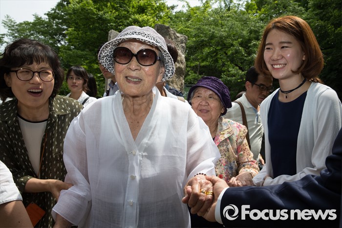 (서울=포커스뉴스) 29일 오전 서울 중구 예장동 옛 통감관저 터에서 열린 일본군 위안부 피해자 추모공원 '기억의 터' 기공식에 참석한 김복동(왼쪽 두 번째), 길원옥(오른쪽 두 번째) 할머니가 행사장을 나서고 있다.