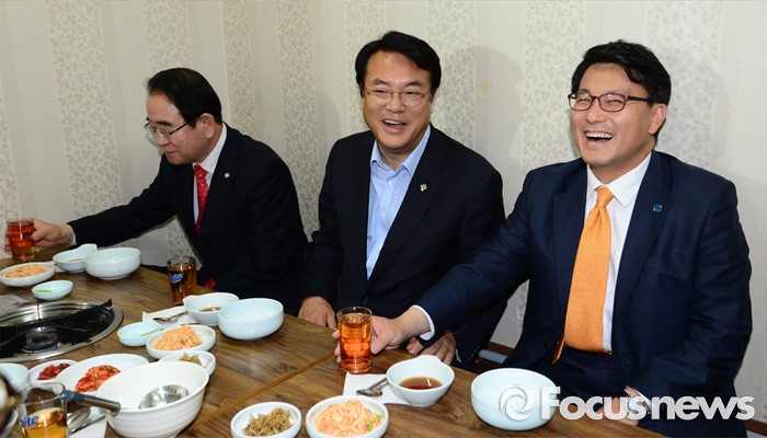 (서울=포커스뉴스) 정진석(가운데) 새누리당 원내대표, 박명재(왼쪽) 사무총장이 29일 오후 서울 여의도 한 음식점에서 열린 복당 의원들과의 오찬에 참석해 윤상현 의원 등과 대화하고 있다.