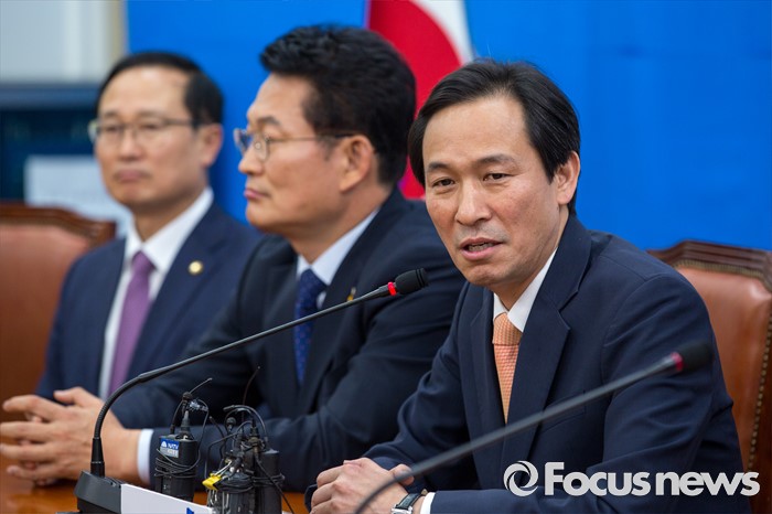 (서울=포커스뉴스) 우상호 더불어민주당 원내대표가 29일 오후 서울 여의도 국회에서 열린 '서해 5도 중국어선 불법조업 대책 마련 및 해양주권 수호 위안 협약식'에 참석해 모두발언 하고 있다.