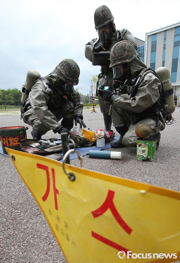 (세종=포커스뉴스) 29일 오후 세종시 정부세종청사경비대에서 열린 적 특수전부대원 침투 및 화학폭탄 폭발 대응 민·관·군·경 합동 민방위훈련에서 32시단 화학대대 병력들이 화학폭발물 수거를 하고 있다.