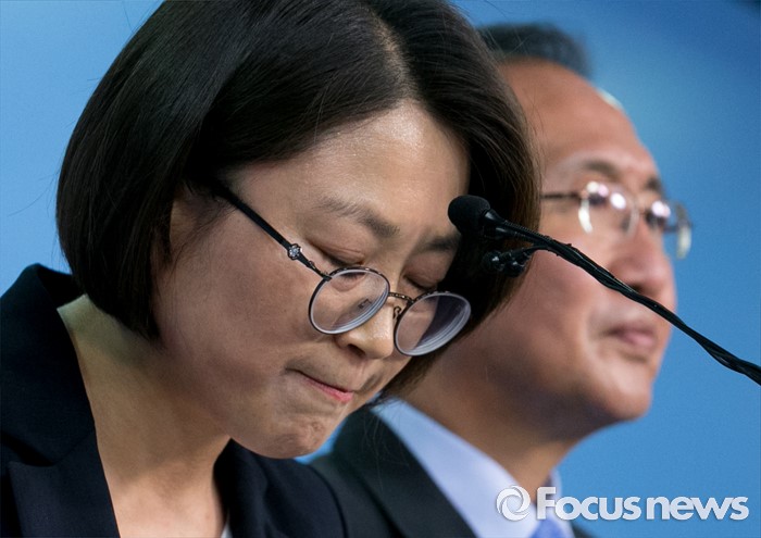 (서울=포커스뉴스) 29일 오후 서울 여의도 국회 정론관에서 미래창조과학방송통신위원회 재배정을 요구하며 농성에 들어갔던 추혜선(왼쪽) 정의당 의원과 노회찬 원내대표가 농성을 해제하고 외교통일위원회 배정을 받아들이는 내용의 기자회견을 하고 있다.