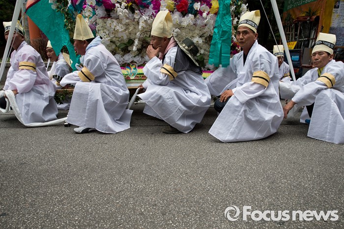 (서울=포커스뉴스) 29일 오후 서울 영등포구 국회의사당 인근에서 전국화훼협회 등 27개 단체원들이 김영란법 반대를 외치며 꽃상여를 메고 행진하고 있다.