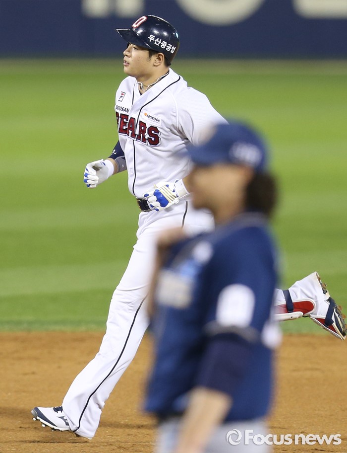 (서울=포커스뉴스) 29일 서울 잠실구장에서 열린 2016 프로야구 NC-두산 경기 6회말 무사 1,2루에서 두산 김재환이 좌월 3점 홈런을 치고 그라운드를 돌고 있다.