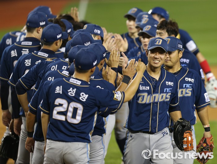 (서울=포커스뉴스) 29일 서울 잠실구장에서 열린 2016 프로야구 NC-두산 경기에서 두산을 물리치고 4연패의 늪에서 벗어난 NC 선수들이 하이파이브하며 승리의 기쁨을 나누고 있다.