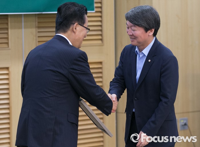 (서울=포커스뉴스) 30일 오전 서울 여의도 국회 의원회관에서 열린 국민의당 22차 집중역량강화 워크숍에 참석한 박지원(왼쪽) 비대위원장이 안철수 전 대표에게 우수의원상 시상을 하고 있다.