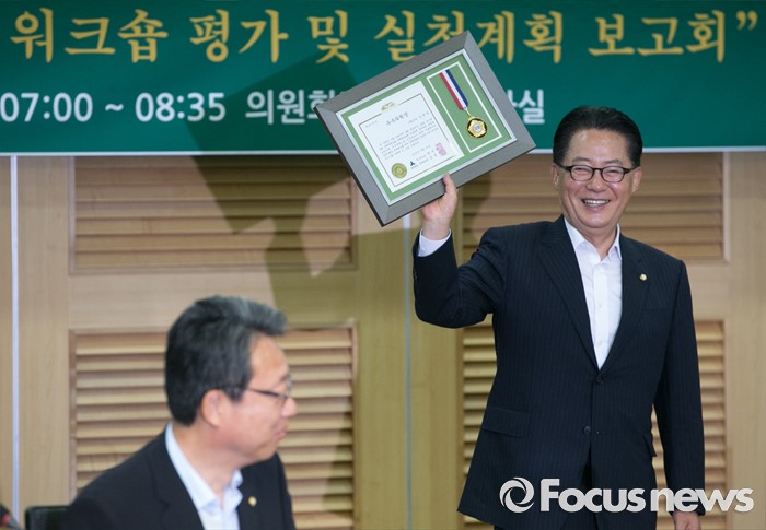(서울=포커스뉴스) 30일 오전 서울 여의도 국회 의원회관에서 열린 국민의당 22차 집중역량강화 워크숍에 참석한 박지원 비대위원장이 우수의원들에게 시상하기 위해 준비한 상패를 들어보이고 있다.