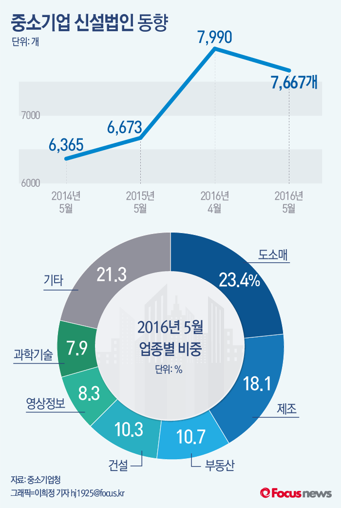 (서울=포커스뉴스) 30일 중소기업청에 따르면 2016년 5월 중소기업 신설법인은 7,667개로 5월 실적기준 최대치를 기록했다. 업종별로는 도소매업이 가장 높은 비중을 차지했다.