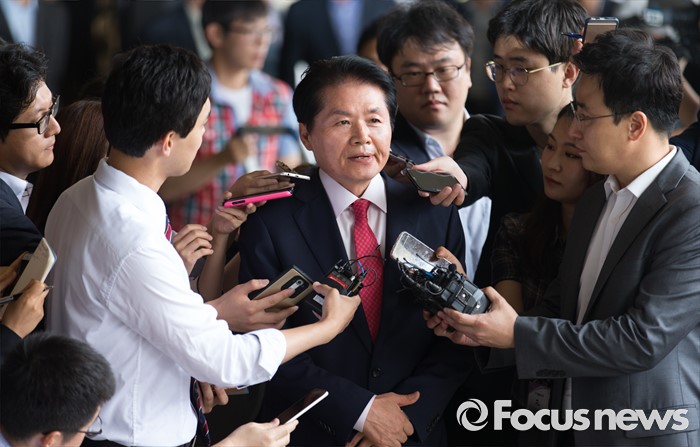 (서울=포커스뉴스) 농협중앙회장 부정선거의혹 관련 김병원 농협 회장이 조사 받기 위해 피의자 신분으로 30일 오전 서울 서초구 서울중앙지방검찰청으로 들어서며 취재진 질문에 답하고 있다.