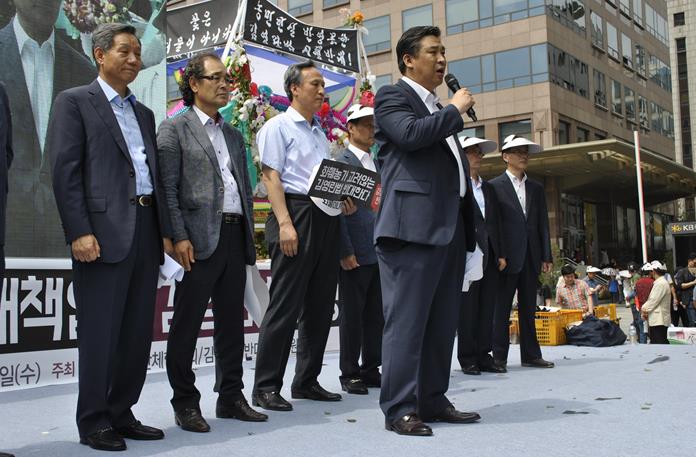 소상공인연합회 관계자는 "향후 화원협회와 화훼협회 등 관련 소상공인들과 김영란법 취지는 살리면서도 소상공인들의 어려움을 조금이나마 해소할 수 있도록 모든 소상공인들과 그 뜻을 하나로 모을 것"이라고 밝혔다.소상공인연합회 최승재 회장(맨 앞)과 회장단이 집회 현장에서 연단에 올라 참가자들을 격려하고 있다.<사진제공=소상공인연합회>