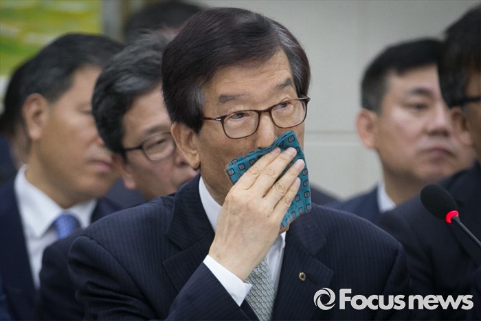(서울=포커스뉴스) 30일 오전 서울 여의도 국회에서 열린 정무위원회 전체회의에 참석한 이동걸 한국산업은행 회장이 얼굴을 닦고 있다.