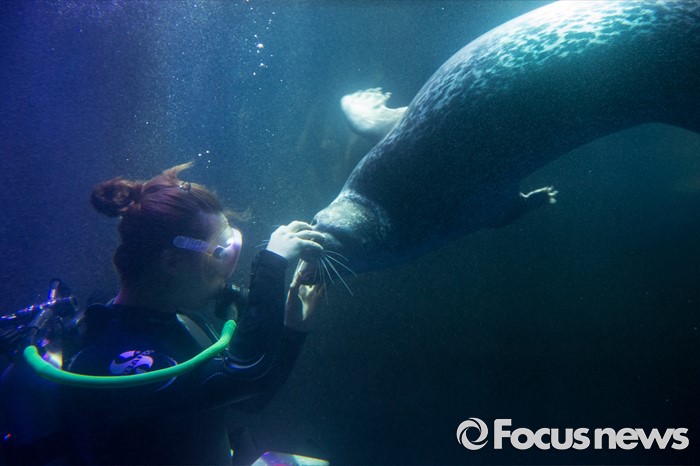 (서울=포커스뉴스) 30일 오전 서울 영등포구 여의도 한화 아쿠아플라넷63에서 열린 수족관 리뉴얼 오픈 기념행사에서 다이버가 물범의 상태를 체크하고 있다.