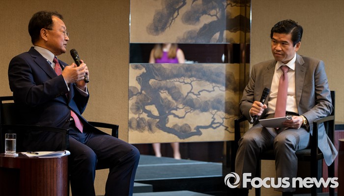 (서울=포커스뉴스) 유일호 경제부총리 겸 기획재정부 장관이 30일 오후 서울 용산구 그랜드하얏트 서울에서 열린 주한미국상공회의소 초청 오찬간담회에 참석해 사회자의 질문에 답하고 있다.