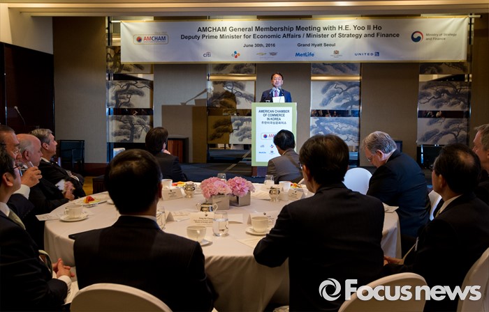 (서울=포커스뉴스) 유일호 경제부총리 겸 기획재정부 장관이 30일 오후 서울 용산구 그랜드하얏트 서울에서 열린 주한미국상공회의소 초청 오찬간담회에 참석해 기조연설을 하고 있다.