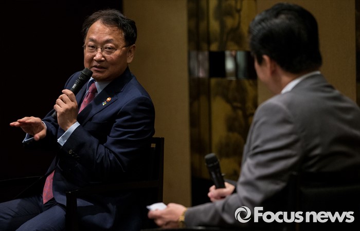(서울=포커스뉴스) 유일호 경제부총리 겸 기획재정부 장관이 30일 오후 서울 용산구 그랜드하얏트 서울에서 열린 주한미국상공회의소 초청 오찬간담회에 참석해 사회자의 질문에 답하고 있다.