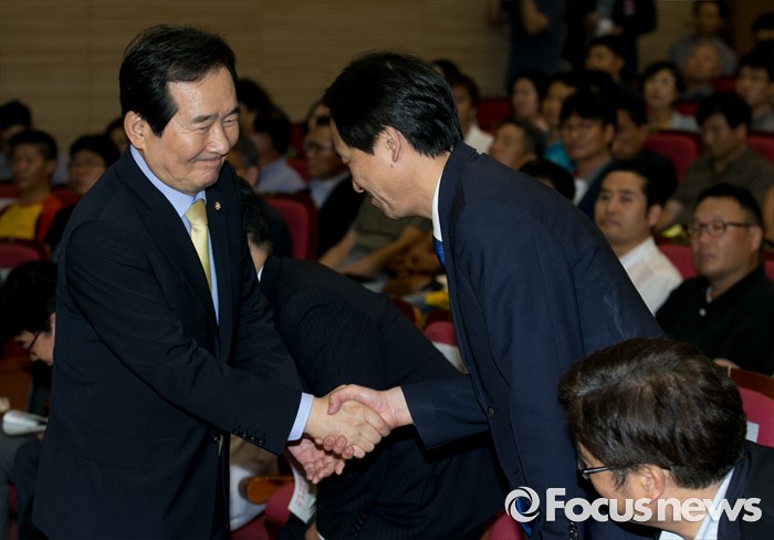 (서울=포커스뉴스) 30일 오후 서울 여의도 국회 의원회관에서 열린 전국가맹점주 피해사례 발표 및 관련법 개정촉구 대회에 참석한 정세균(왼쪽) 국회의장과 우상호 더불어민주당 원내대표가 인사하고 있다.