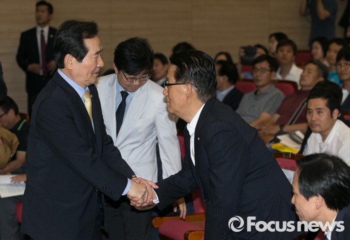 (서울=포커스뉴스) 30일 오후 서울 여의도 국회 의원회관에서 열린 전국가맹점주 피해사례 발표 및 관련법 개정촉구 대회에 참석한 정세균(왼쪽) 국회의장과 박지원 국민의당 원내대표가 인사하고 있다.
