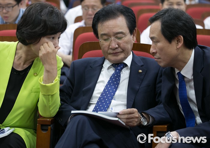 (서울=포커스뉴스) 30일 오후 서울 여의도 국회 의원회관에서 열린 더불어민주당 건강보험 부과체계 개편안 공청회에 참석한 우상호(오른쪽부터) 원내대표, 변재일 정책위의장, 남인순 의원이 대화하고 있다.