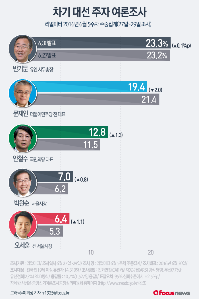(서울=포커스뉴스) 여론조사 전문기관 리얼미터가 30일 발표한 6월 5주차 주중동향 여론조사 결과에 따르면 반기문 유엔 사무총장이 문재인 더불어민주당 전 대표와 격차를 벌리며 1위 자리를 이어가고 있다.