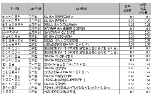 저위험군 상품에서는 SK증권의 ISA 안정추구형A(0.34%), 메리츠종금증권의 ISA안정지향형B(0.37%)가 수익률이 낮은 ‘TOP 10’안에 들었다.