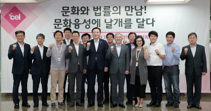 (서울=포커스뉴스) 김종덕 문체육관광부 장관과 김현웅 법무부 장관이 30일 서울 중구 문화창조벤처단지에서 문체부와 법무부 간 ‘문화융성을 위한 법률 지원, 문화 인프라 지원'에 관한 업무협약(MOU) 체결을 마치고 열린 문화창조벤처단지 입주기업 간담회 참석자들과 기념촬영을 하고 있다. <사진제공=문화체육관광부>