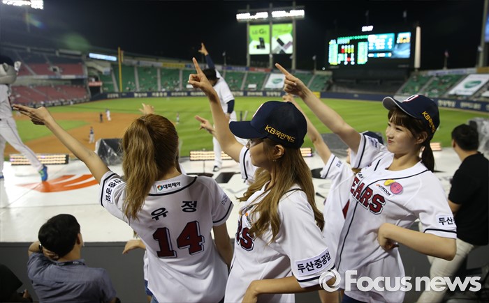 (서울=포커스뉴스) 30일 서울 잠실구장에서 열린 2016 프로야구 NC-두산 경기에서 인기 걸그룹 '라붐'이 경기전 시구에 이어 클리닝타임에 응원단상에 올라 귀엽고 깜찍한 율동으로 관중들에게 한 여름의 더위를 식혀주는 깜짝 공연을 펼쳤다.