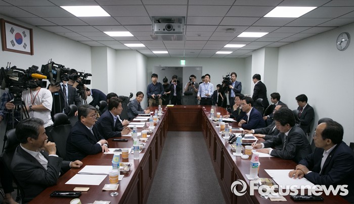 (서울=포커스뉴스) 1일 오전 서울 여의도 국회 의원회관에서 영남권 신공항 백지화 및 대구 공군비행장 이전과 존치문제 등 논의를 위해 열린 새누리당 대구지역 의원들과의 간담회에 참석한 권영진 대구시장과 의원들이 대화하고 있다.