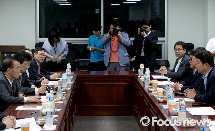 (서울=포커스뉴스) 1일 오전 서울 여의도 국회 의원회관에서 영남권 신공항 백지화 및 대구 공군비행장 이전과 존치문제 등 논의를 위해 열린 새누리당 대구지역 의원들과의 간담회에 참석한 권영진 대구시장과 의원들이 대화하고 있다.