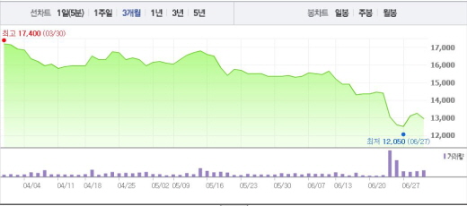 검찰이 FNC엔터에 대해 압수수색을 실시했다는 소식이 알려진 23일(종가 1만3050원) 이후 주가는 급락했다. 27일에는 52주 최저가를 경신하며 1만2050원을 나타내기도 했다.