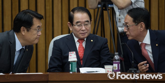 (서울=포커스뉴스) 정진석(왼쪽) 새누리당 원내대표와 박명재(가운데) 사무총장, 김도읍 원내수석부대표가 1일 오전 서울 여의도 국회에서 열린 원내대책회의에서 대화하고 있다.