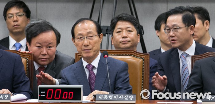 (서울=포커스뉴스) 1일 오전 서울 여의도 국회에서 열린 운영위원회 전체회의에 참석한 이원종(가운데) 대통령비서실장과 김재원(왼쪽) 청와대 정무수석, 강석훈 경제수석이 대화하고 있다.