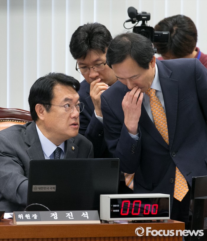 (서울=포커스뉴스) 1일 오전 서울 여의도 국회에서 열린 운영위원회 전체회의에 참석한 정진석(왼쪽) 위원장과 우상호 더불어민주당 원내대표가 대화하고 있다.
