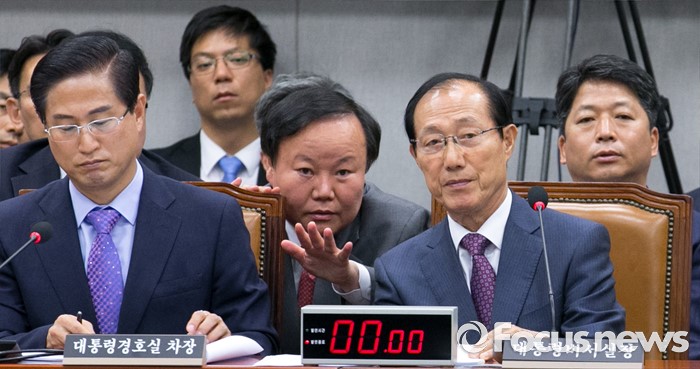 (서울=포커스뉴스) 1일 오전 서울 여의도 국회에서 열린 운영위원회 전체회의에 참석한 이원종(오른쪽) 대통령비서실장과 김재원(가운데) 청와대 정무수석이 대화하고 있다.
