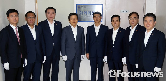 (서울=포커스뉴스) 황교안 국무총리를 비롯한 참석자들이 1일 오후 서울 종로구 정부서울청사에서 제1차 국가테러대책위원회를 마친 후 대테러센터 현판식을 하고 있다. 왼쪽부터 최윤수 국정원 제2차장, 홍윤식 행정자치부 장관, 김현웅 법무부 장관, 황교안 국무총리, 문영기 대테러센터장, 한민구 국방부 장관, 이석준 국무조정실장, 강신명 경찰청장.