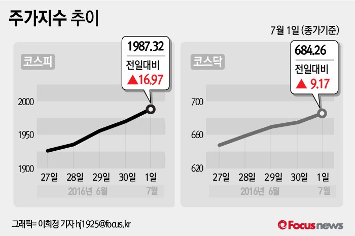 (서울=포커스뉴스)1일 코스피지수는 전날보다 0.86%(16.97포인트) 오른 1987.32에 장을 마쳤다. 코스닥지수는 전일 대비 1.36%(9.17포인트) 오른 684.26에 마감했다.