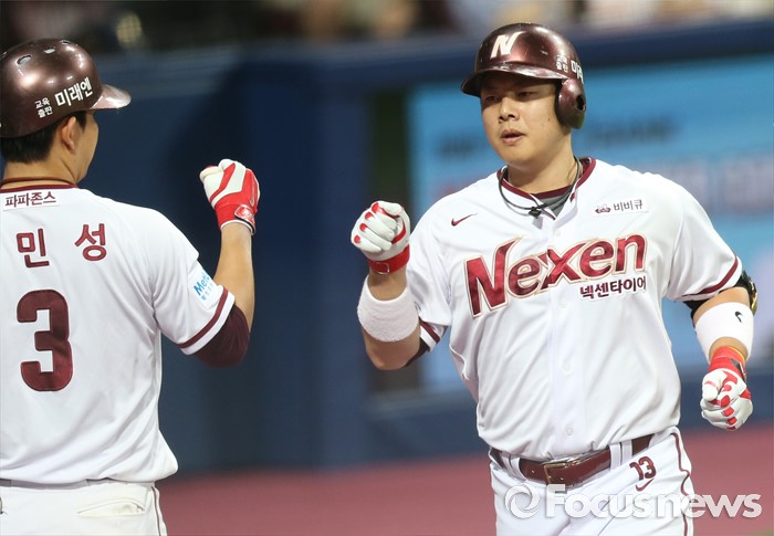 (서울=포커스뉴스) 1일 서울 고척 스카이돔에서 열린 2016 프로야구 KIA-넥센 경기 6회말 1사후 넥센 윤석민이 좌월 솔로 홈런을 치고 김민성의 환영을 받으며 홈인하고 있다.
