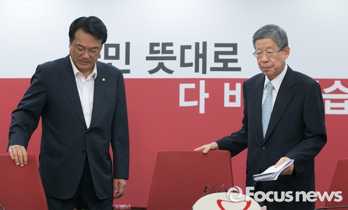 (서울=포커스뉴스) 4일 오전 서울 여의도 새누리당사에서 열린 혁신비상대책위원회의에 참석한 김희옥(오른쪽) 위원장과 정진석 원내대표가 참석하고 있다.