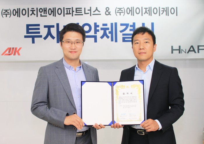 한편 HnAP는 2010년 투자전문회사로 설립돼 영화 '암살', '사도' 등 영화 투자와 뮤지컬 투자 등 문화 콘텐츠 투자는 물론 10여개의 유망 벤처에도 투자해 왔다. 최근에는 기업용 커뮤니케이션 앱 '잔디'의 개발 기업에 투자를 진행한 바 있다.AJK 스탁포인트가 에이치앤에이파트너즈 등으로부터 10억원의 투자를 유치하고 협약식을 진행했다. 왼쪽부터 김인규 AJK대표, HnAP 박훈정 대표.