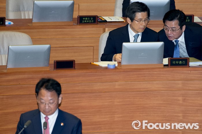 (서울=포커스뉴스) 4일 오전 서울 여의도 국회에서 열린 343회 국회(임시회) 6차 본회의, 경제에 관한 대정부 질문에 참석한 황교안(뒷줄 가운데) 국무총리가 관계자와 대화하고 있다. 왼쪽 아래는 유일호 경제부총리 겸 기획재정부 장관.