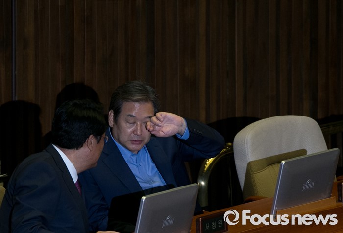 (서울=포커스뉴스) 4일 오전 서울 여의도 국회에서 열린 343회 국회(임시회) 6차 본회의, 경제에 관한 대정부 질문에 참석한 정진석(왼쪽) 새누리당 원내대표와 김무성 전 대표가 대화하고 있다.