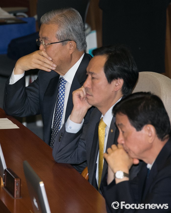 (서울=포커스뉴스) 4일 오전 서울 여의도 국회에서 열린 343회 국회(임시회) 6차 본회의, 경제에 관한 대정부 질문에 참석한 김종인(왼쪽부터) 더불어민주당 비대위 대표, 우상호 원내대표, 진영 의원이 생각에 잠겨 있다.