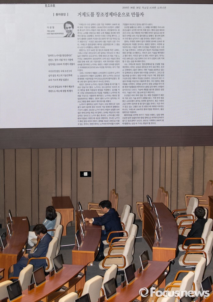 (서울=포커스뉴스) 4일 오전 서울 여의도 국회에서 열린 343회 국회(임시회) 6차 본회의, 경제에 관한 대정부 질문에 참석한 김한표 새누리당 의원이 유일호 경제부총리 겸 기획재정부 장관에게 한 언론기사를 보여주며 질문하고 있다.