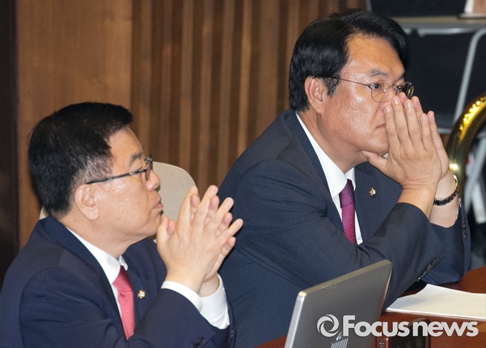 (서울=포커스뉴스) 4일 오후 서울 여의도 국회에서 열린 343회 국회(임시회) 6차 본회의, 경제에 관한 대정부 질문에 참석한 정진석(오른쪽) 새누리당 원내대표와 김광림 정책위의장이 대정부 질문을 지켜보고 있다.