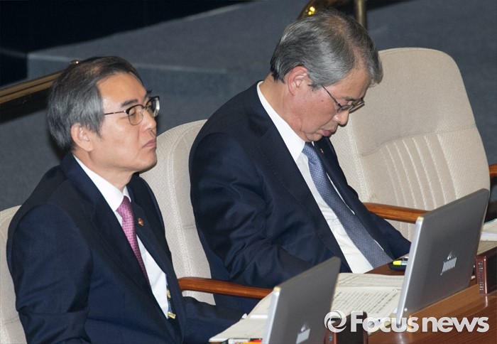 (서울=포커스뉴스) 4일 오후 서울 여의도 국회에서 열린 343회 국회(임시회) 6차 본회의, 경제에 관한 대정부 질문에 참석한 임종룡(오른쪽) 금융위원장이 피곤한 모습을 보이고 있다.