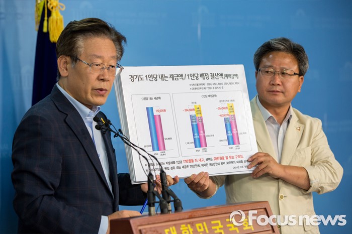 (서울=포커스뉴스) 이재명(왼쪽) 경기도 성남시장과 채인석 경기도 화성시장이 4일 오후 서울 여의도 국회에서 행정자치부의 지방재정법 시행령 개정안 입법예고 철회를 촉구하는 기자회견을 하고 있다.