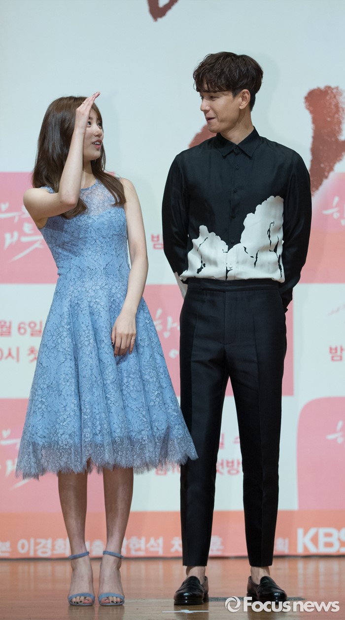 (서울=포커스뉴스) 4일 오후 서울 용산구 하얏트호텔 그랜드볼룸에서 열린 KBS 특별기획드라마 '함부로 애틋하게' 제작발표회에 참석한 배우 배수지(왼쪽)와 임주환이 포토타임을 갖고 있다.
