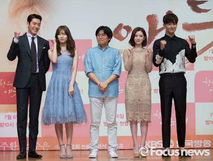 (서울=포커스뉴스) 4일 오후 서울 용산구 하얏트호텔 그랜드볼룸에서 열린 KBS 특별기획드라마 '함부로 애틋하게' 제작발표회에 참석한 배우 김우빈(왼쪽부터), 배수지, 박현석 PD, 임주은, 임주환이 포토타임을 갖고 있다.
