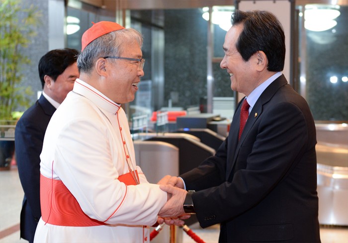 (서울=포커스뉴스) 정세균(오른쪽) 국회의장이 4일 오후 서울 여의도 국회에서 염수정 추기경을 접견, 인사하고 있다. <사진제공=국회>